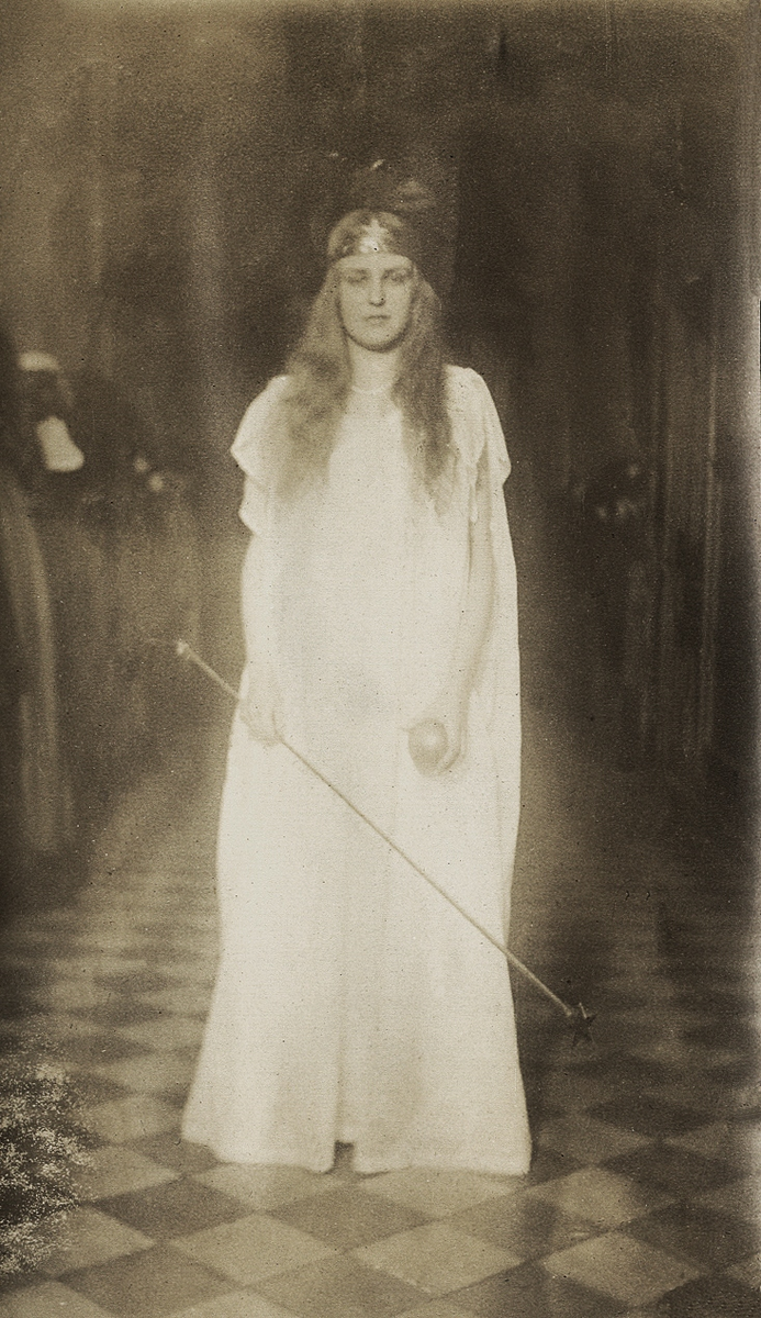 En ung kvinna utklädd till fe, vid ett julspel (?) i domkyrkan (?), Växjö.
