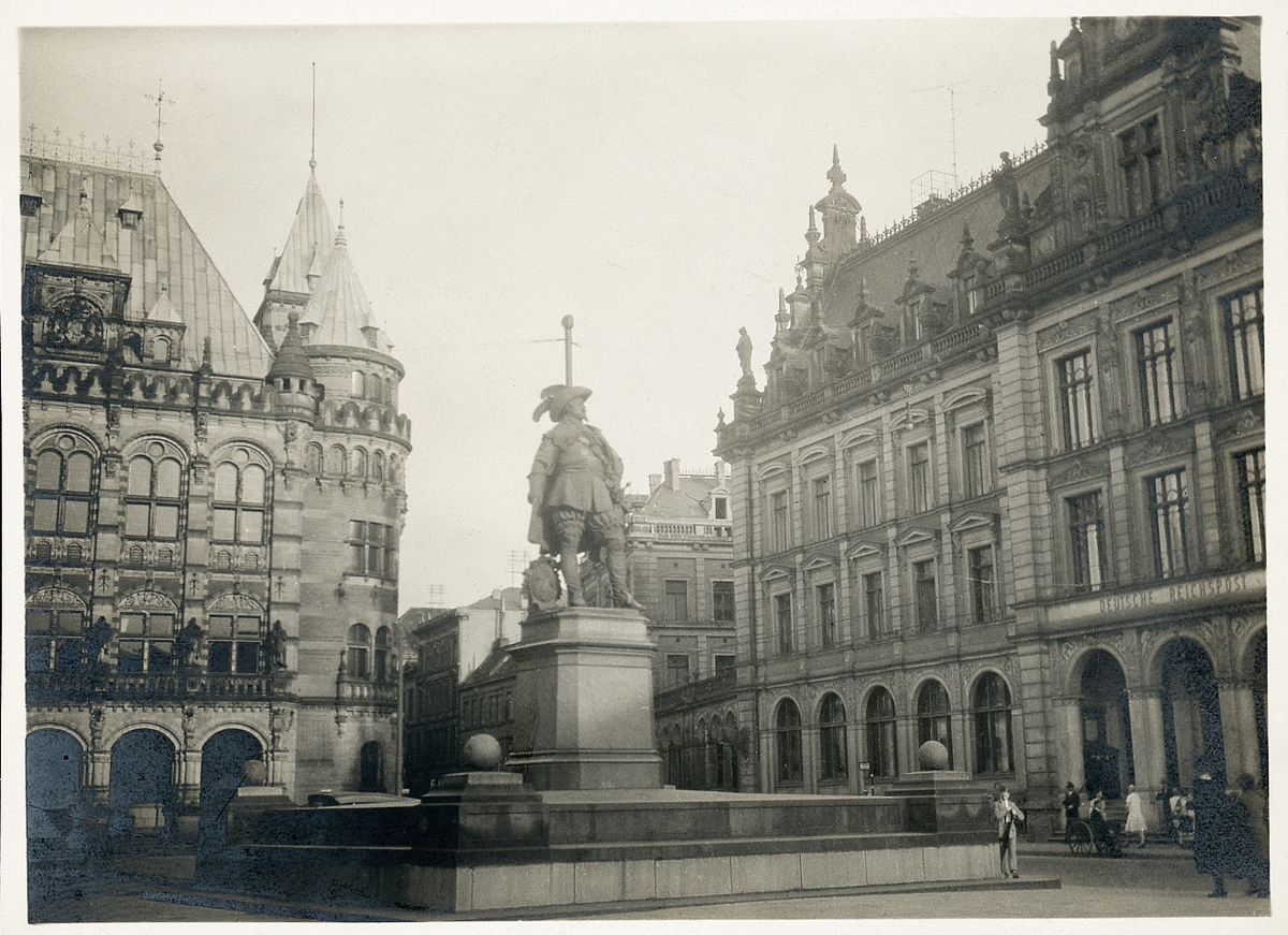 Vy över torget i Lützen med statyn över Gustaf Adolf m.m.