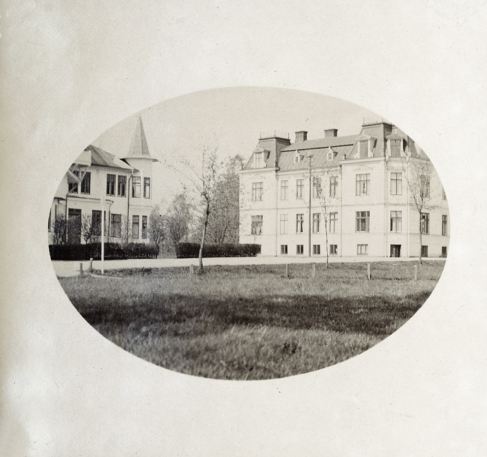Vy över två bostadshus vid Värendsgatan, Växjö. Trol. avser texten huset till höger (kv. Skytten 4, Värendsgatan 14).