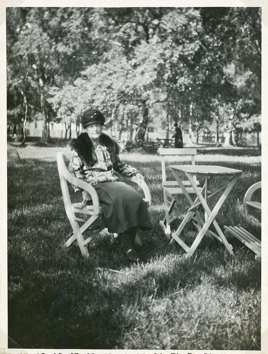 Fru Elisabeth Bergstedt har slagit sig ner i ett trädgårdsmöblemang i Strandbjörket.