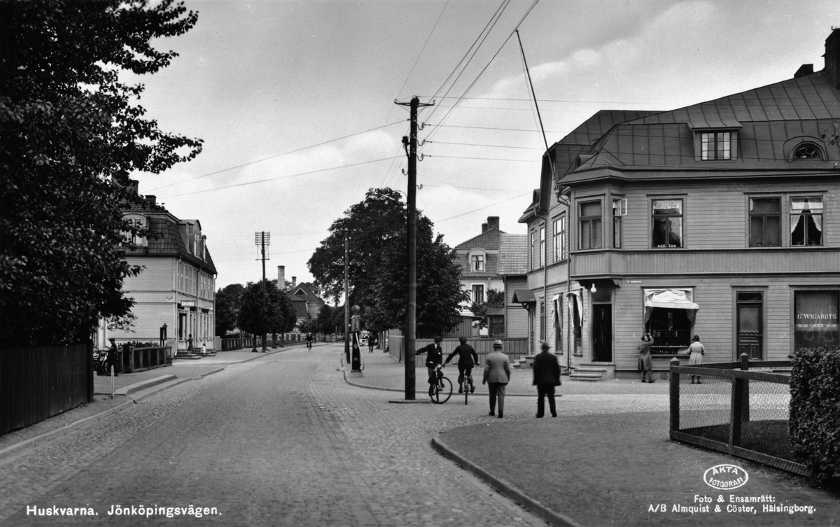 Jönköpingsvägen i Huskvarna. I huset till vänster ligger en Radioaffär och till höger finns G. Wigardts Lager.
