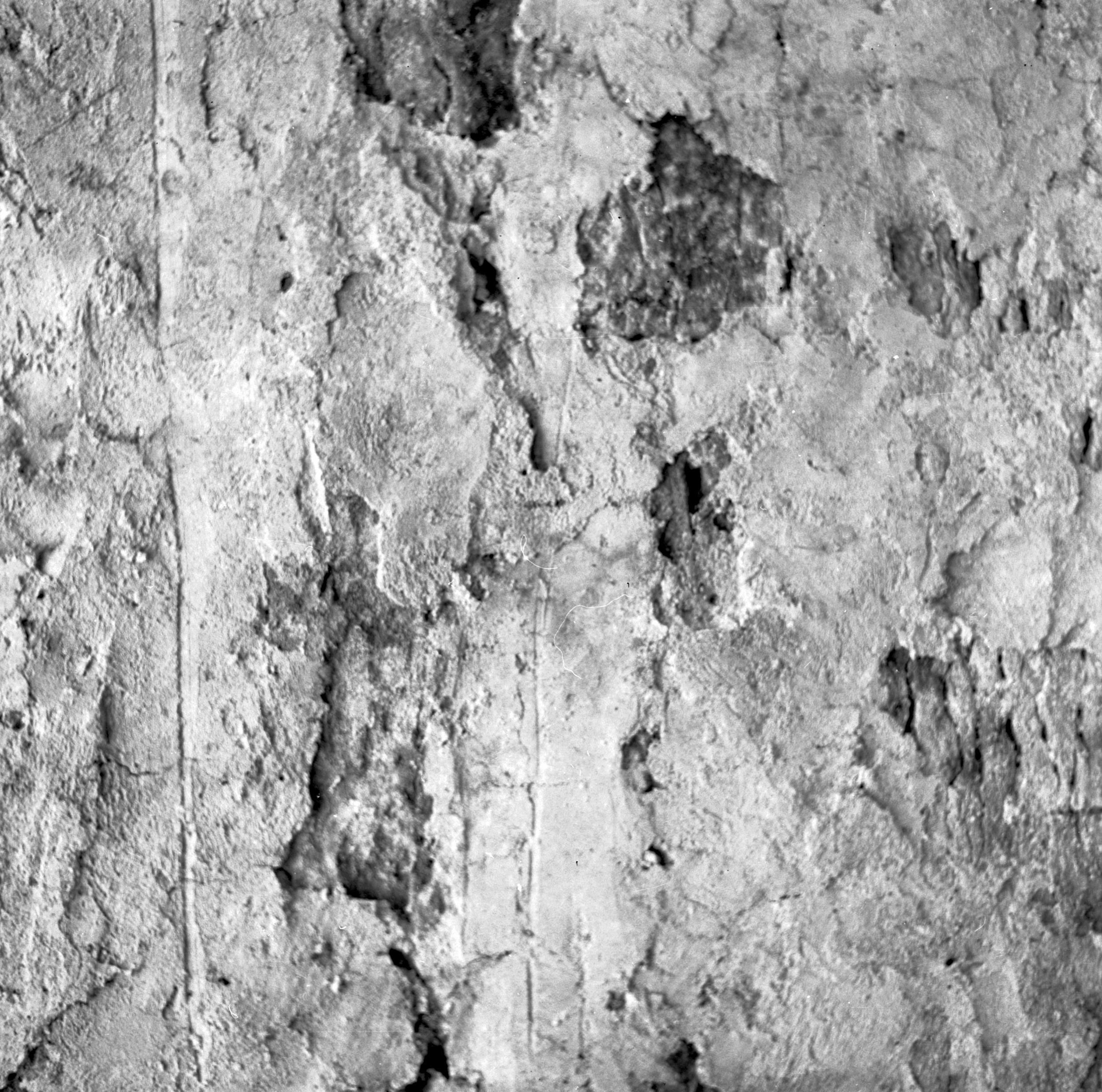 Spår av kvaderritsade fogar på långhusets södra fasad.
