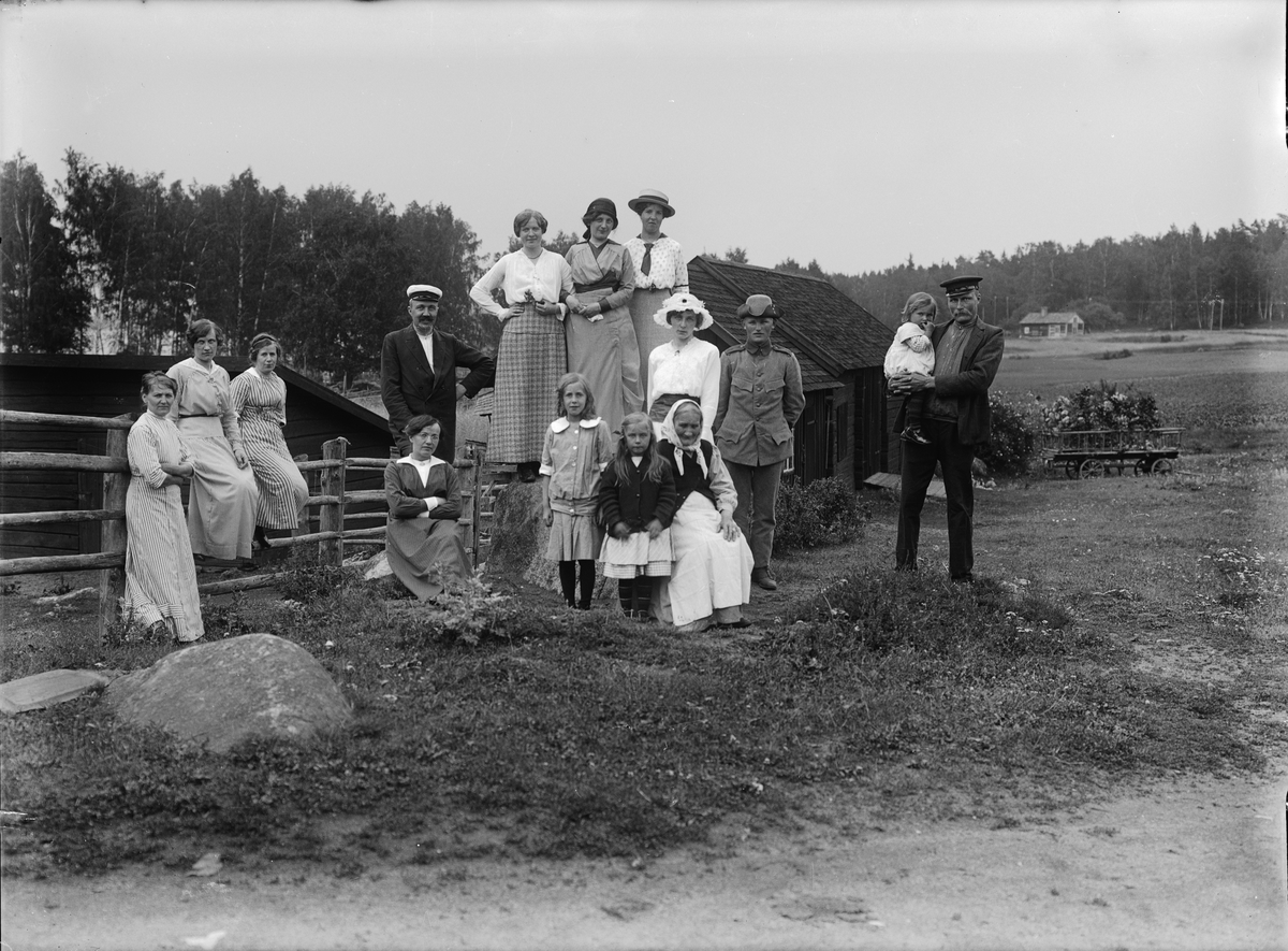 Kvinnor, män och barn ståendes vid hägnad, Uppland
