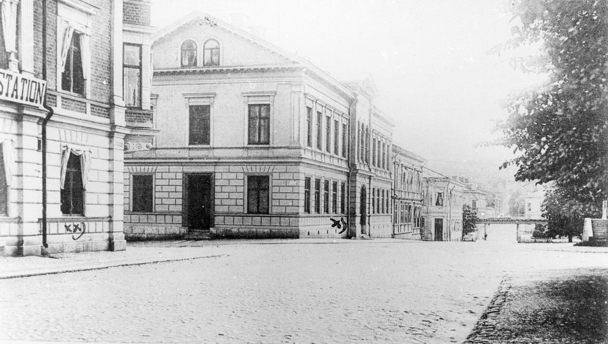 Söderhamn, Kyrkogatan mot söder i början av 1900-talet. Byggnaden till vänster inrymde telegraf- och telefonstation. I mitten Helsingeban