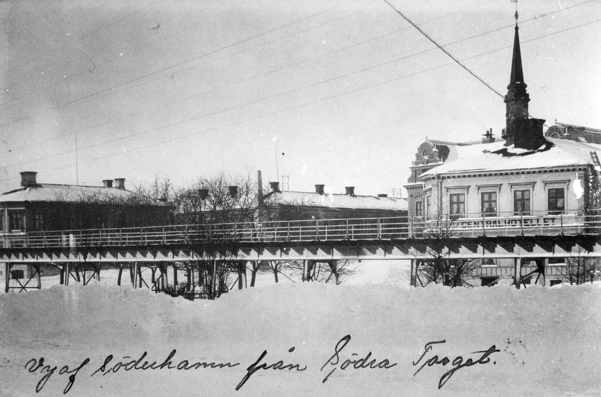 Vykort över Järnvägsviadukten vid Rådhustorget i Söderhamn, omkring år 1900.