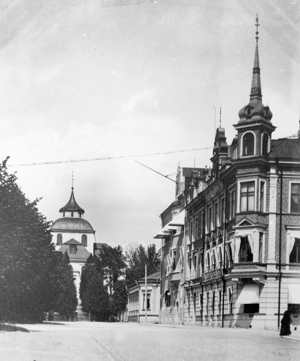 Kyrkogatan med kyrkan i fonden. Till höger kvarter Björnen med de två första trevåningshusen i Söderhamn.
