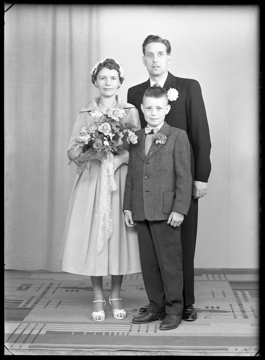 Grupporträtt, bröllop, tre personer, Sigvard Bernövall, Baldersvägen 9A, Hallstahammar.