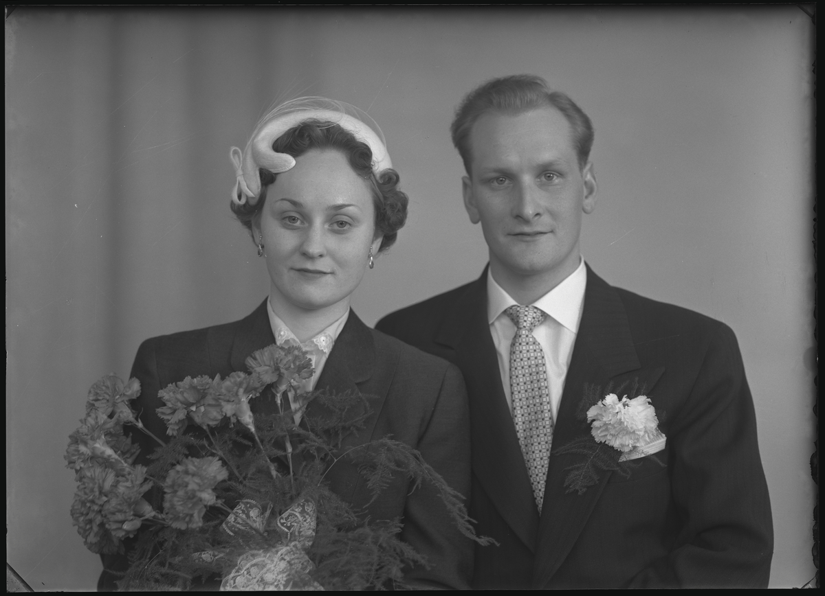 Brudpar, bröstbild. Stig Brickman, Torsvägen 22 A, Hallstahammar.