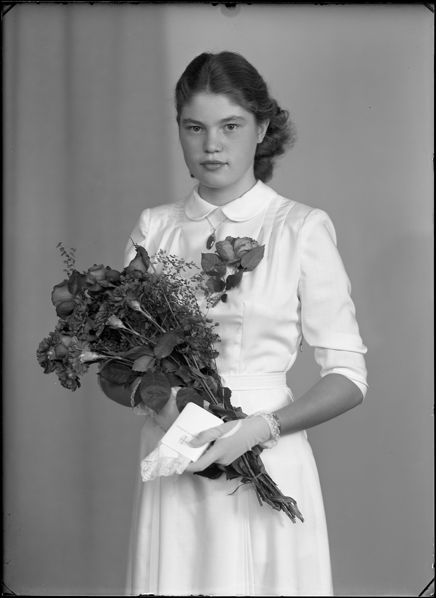 Porträtt, konfirmand Lena. Fru Jenny Söderström, Sickla Strand 37, Nacka.