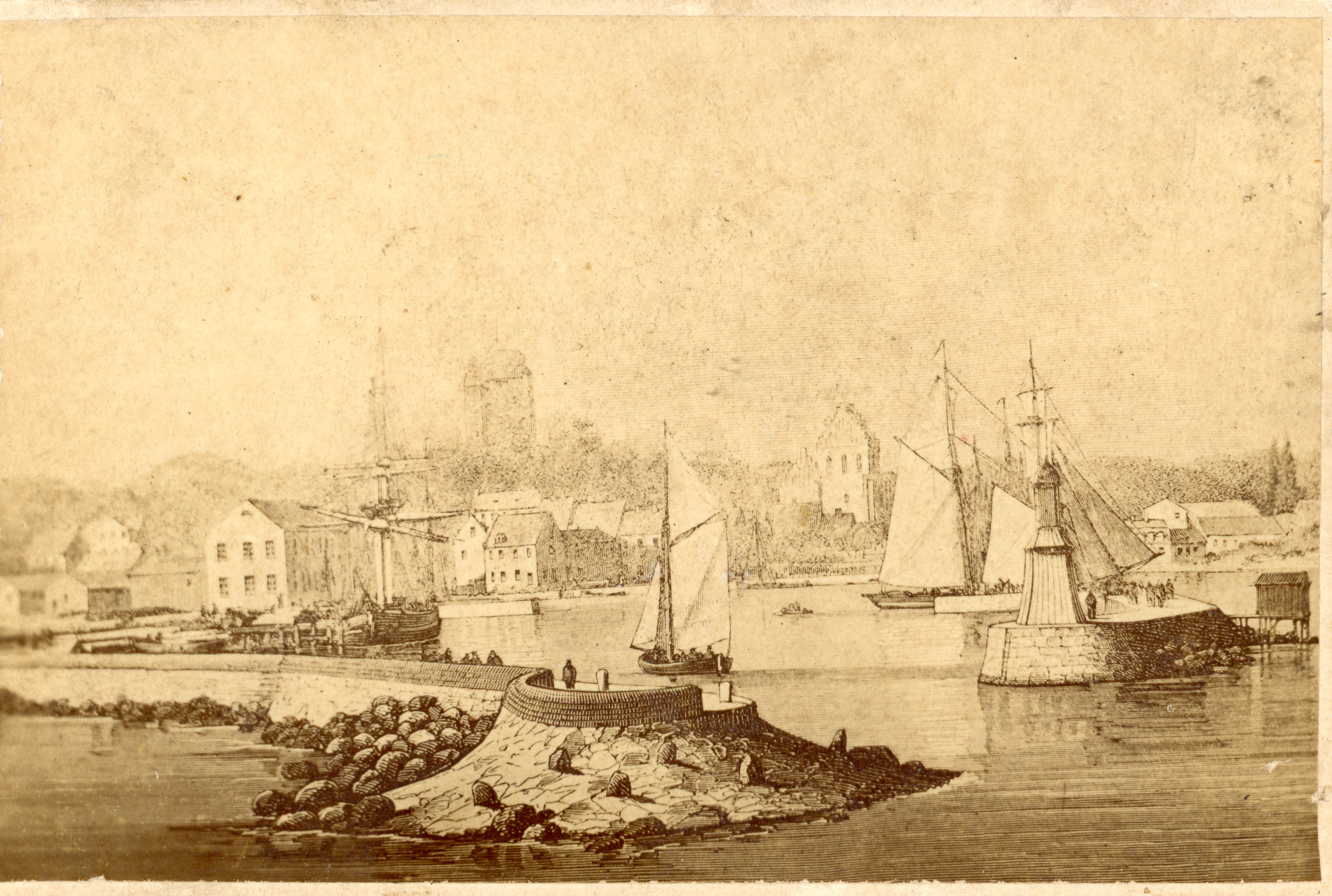 Bilden föreställer i förgrunden inlopp till hamnen med pir och fyr. Flera segelbåtar i hamnen. I bakgrunden Helsingborg centrum med gamla tullhuset, Maria kyrkan och kärnan