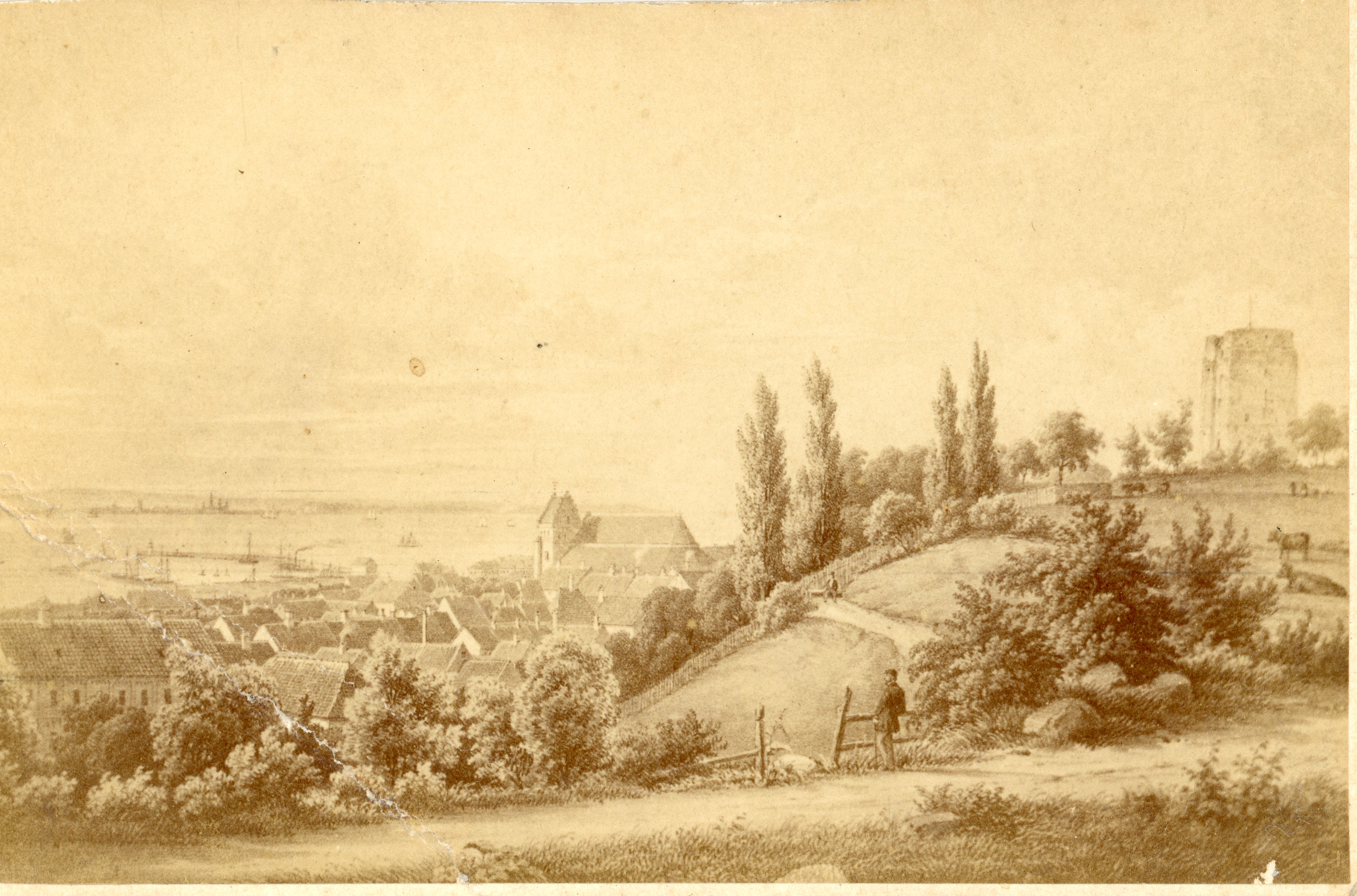 Bilden föreställer i förgrunden åkermark omgivet av buskar. I bakgrunden Helsingborg stad med inre hamnnen och Öresund. Till höger Kärnan orenoverad.