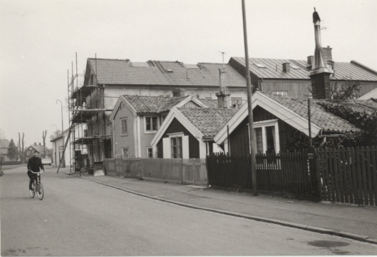 Små bostadshus i Gamla staden, kvarteret Björken på Västerlånggatan i Kalmar. Huset i mitten har fönsterlucka.