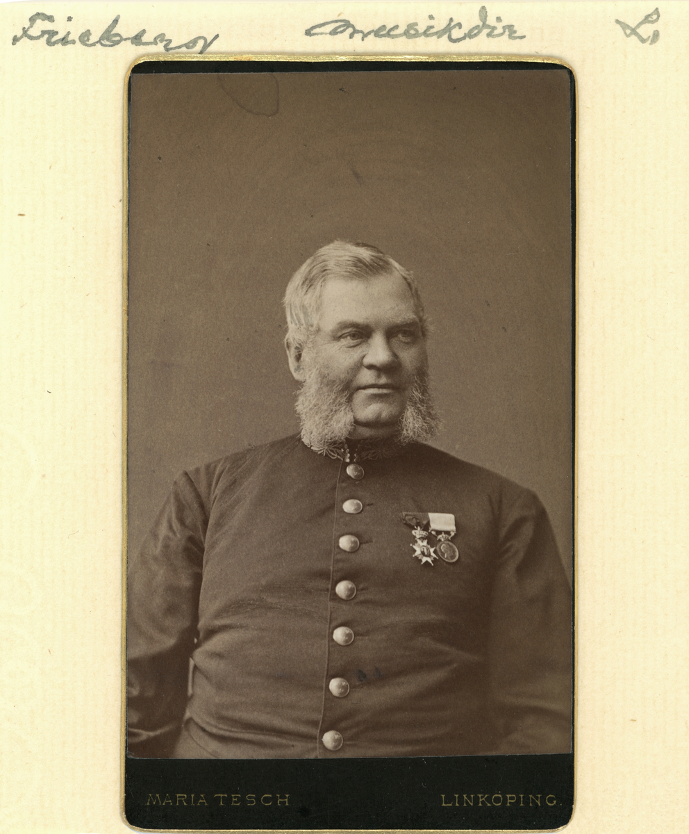 Porträtt av Frans Frieberg något av 1880-talets år. Född 1822 i Appuna i hjärtat av den östgötska jordbruksbygden. I socknens födelsebok står den något oklara anteckningen om honom att han blivit "uteglömd av komministern". Oavsett tolkning kom han emellertid som vuxen att låta sig väl höras, rent av bli rikskänd. Frans var ämnad för en musikalisk bana och genom akademistudier i Stockholm avlade han organistexamen 1840 och musikdirektörexamen 1843. Under åren 18471866 var han yrkesverksam som musiklärare vid läroverket i Norrköping och från sistnämnda år musikdirektör vid Första livgrenadjärregementet i Linköping samt ledamot i Kungliga Musikaliska Akademien. Innan sin flytt till Linköping hade han även parallellt varit verksam som klädesfabrikör i Norrköping. Sannolikt förklarat av att han 1859 gift sig med Gabriella Charlotta Arnberg, dotter till klädesfabrikören Johan Adolf Arnberg.