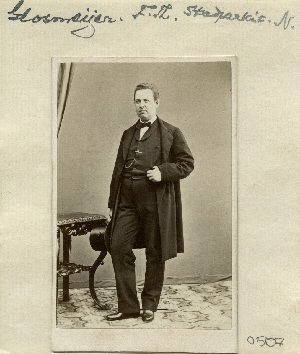 Porträtt av Carl Theodor Glosemeijer. Denne var stadsarkitekt i Norrköping och ritade bland annat fabriksbyggnader i industrilandskapet, Saltängsskolan, Statens skola för vuxna, Lennings sjukhem samt påbyggnad av Gamla tullhuset. Från 1861 gift med Hanna Heijdenberg. 1860-tal.