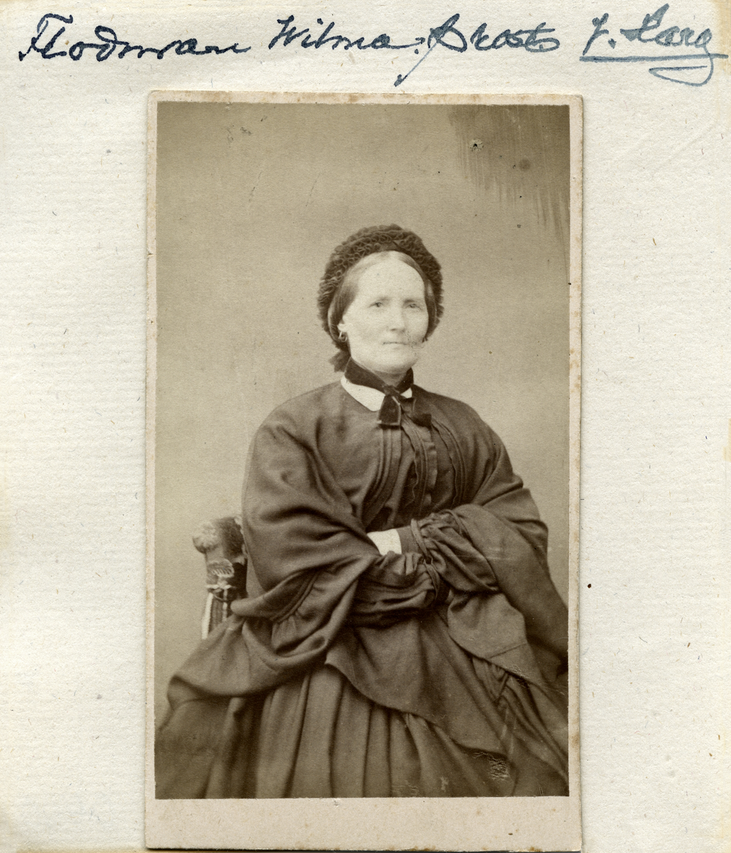 Porträtt av Wilhelmina Lindström. Gift 1832 med Carl Fredrik Flodman, kyrkoherde i Västra Harg. Efter makens död 1865 flyttade hon till Linköping och avled där 1874. Foto omkring 1870.