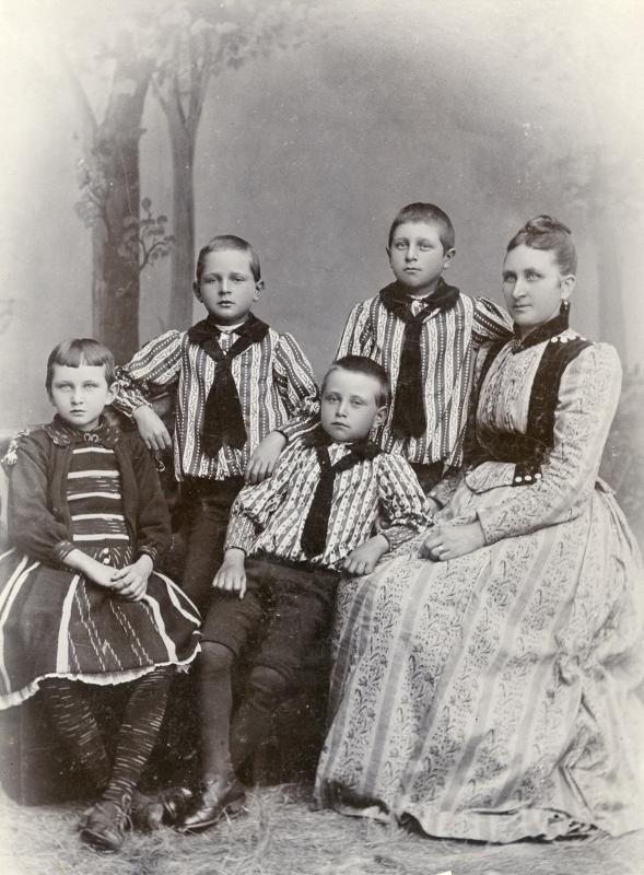 Bilden visar en finklädd familj. Mamma, tre söner och en dotter.