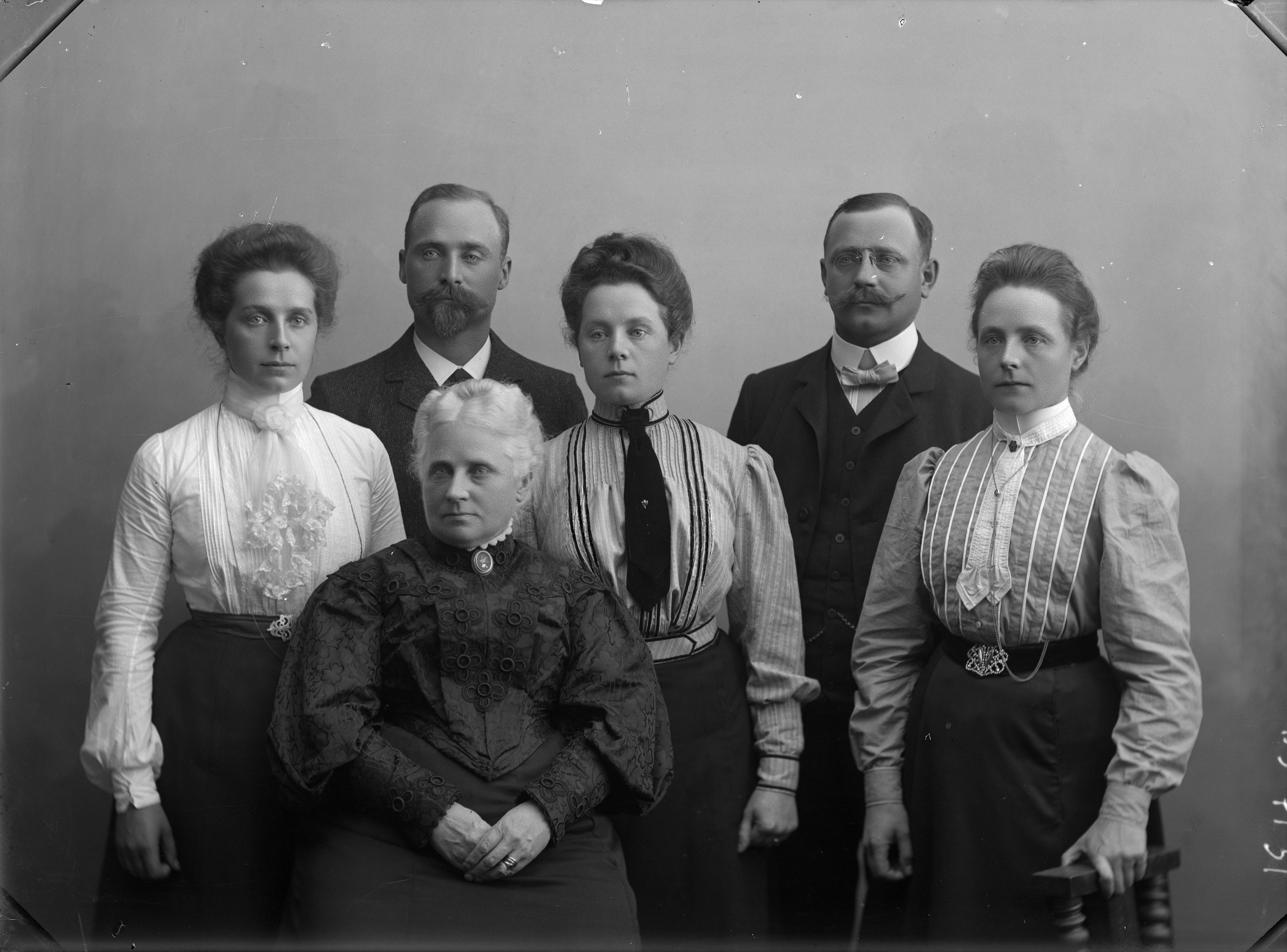Porträtt i helfigur av hamnkaptensänkan Elma Annerstedt med sina fem barn, Sophie, Louise, Thure, Claes och Bertha.
