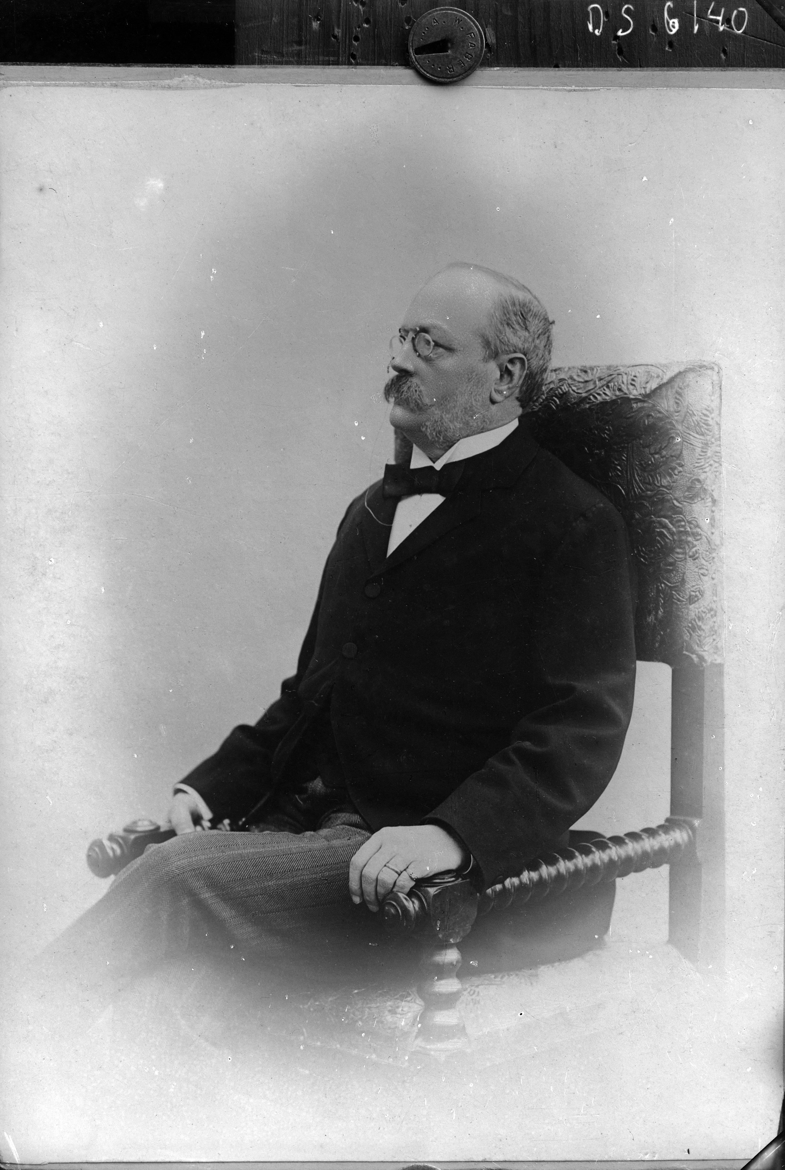 Beskrivning: Porträtt i helfigur av lektorn och tidiningsmannen Carl Herslow sittande i stol.