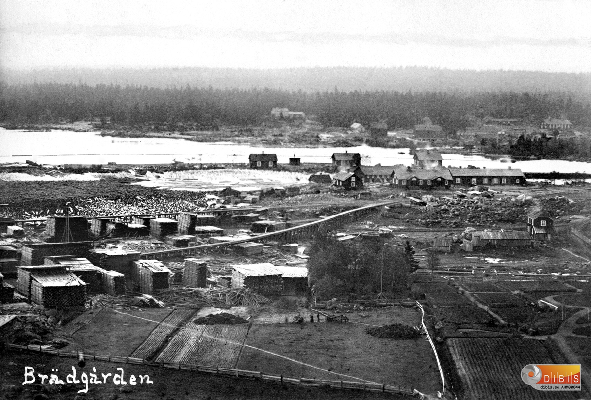 Utsikt från Vårdberget i Ljusne med brädgården till vänster och älvmynningen