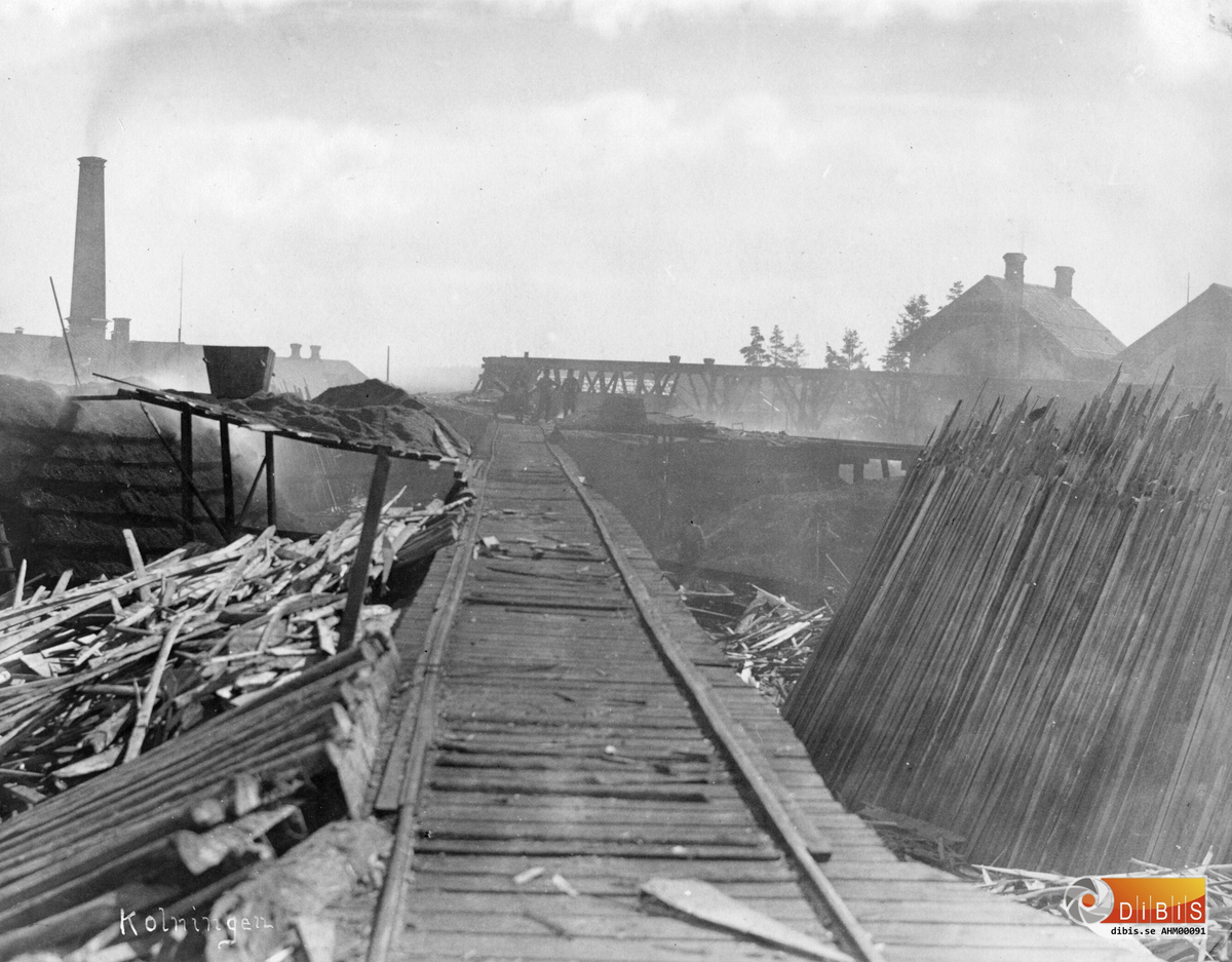 Rälsbanan gick från sågverket till kolningsområdet. Till höger om rälsbanan en rest kolmila av sågverksribb. Bakom kolmilan ser man en kolugn.