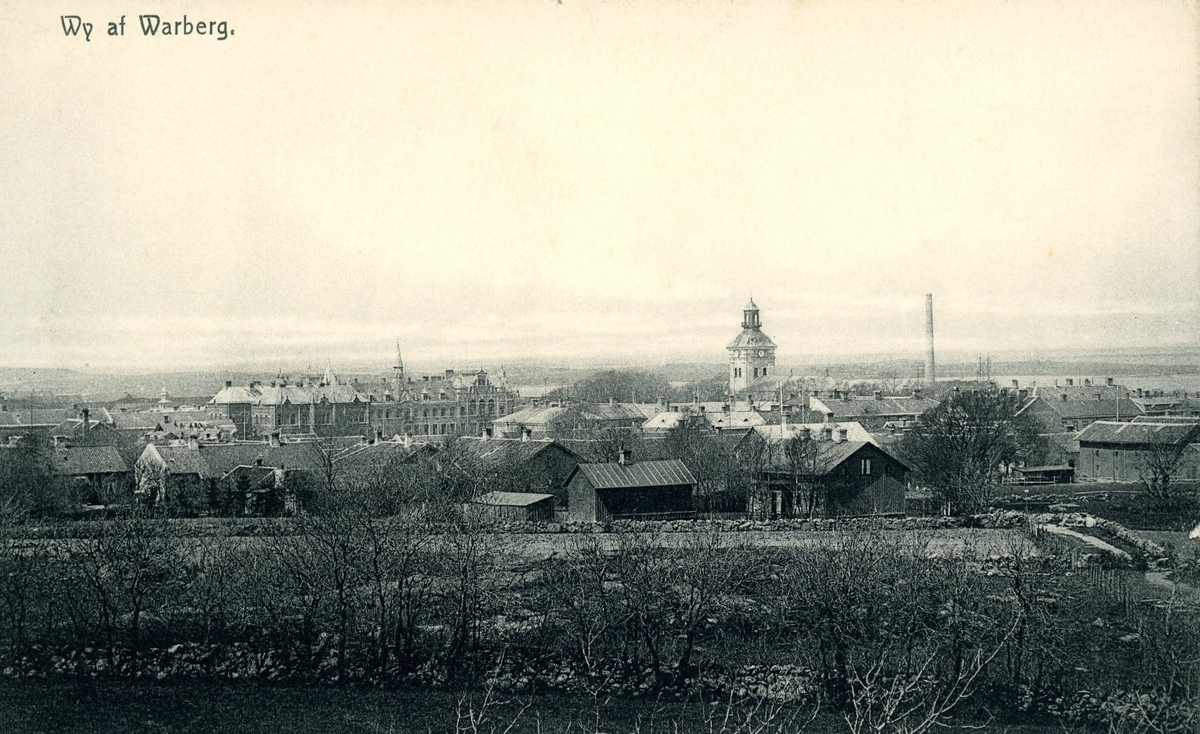 Vykort, "Wy af Warberg". Utsikt över Varberg från gamla Påskberget ca 1915. Man ser Sparbankshuset och Stadshuset/stadshotellet vid torget och kyrktornet.
