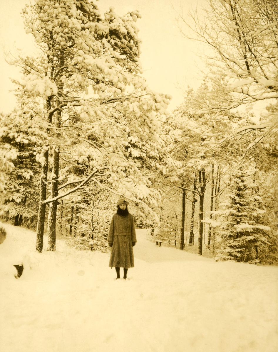 Vinterbild. Kvinna fotograferad bland snötyngda träd på Påskberget (Påskberget friluftsområde).