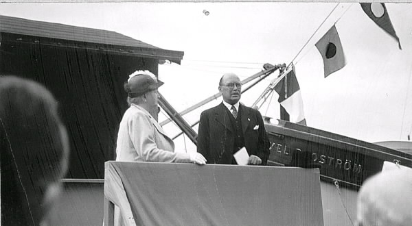 Sjöräddningsbåten "Axel Broström". En man och en kvinna står i talarstol med båten i bakgrunden, prydd med flaggspel. Uppgifter till bilden saknas. Möjligen är bilden från fartygets dop. Eventuellt från varvet där båten är byggd. Tillhör samlingen med fotokopior från Hallands Nyheter som är från 1930-1940-talen.
