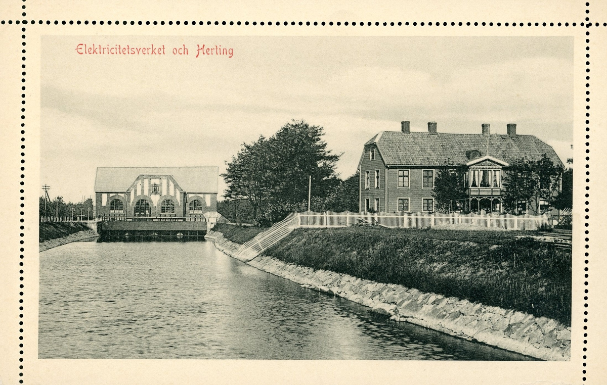 Kortbref, "Elektricitetsverket och Herting". Till höger ses mangårdsbyggnaden till Hertings gård, som har gamla anor. 1651 omvandlades kronohemmanet Herting i dåvarande Skrea socken till gästgivaregård. Staket når ända ner till Ätran. Till vänster ses Hertings kraftverk som anlades 1903. Datering saknas, okänd fotograf men på baksidan anges "Cigarrmagasinet, Falkenberg Imp,"