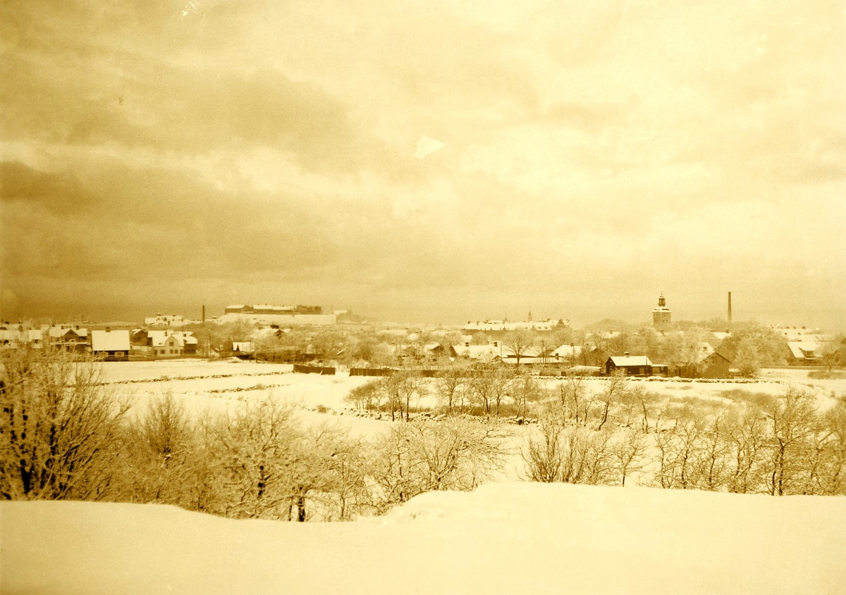 Utsikt över Varberg från Gamla Påskberget i sydöst en snörik dag 1924.