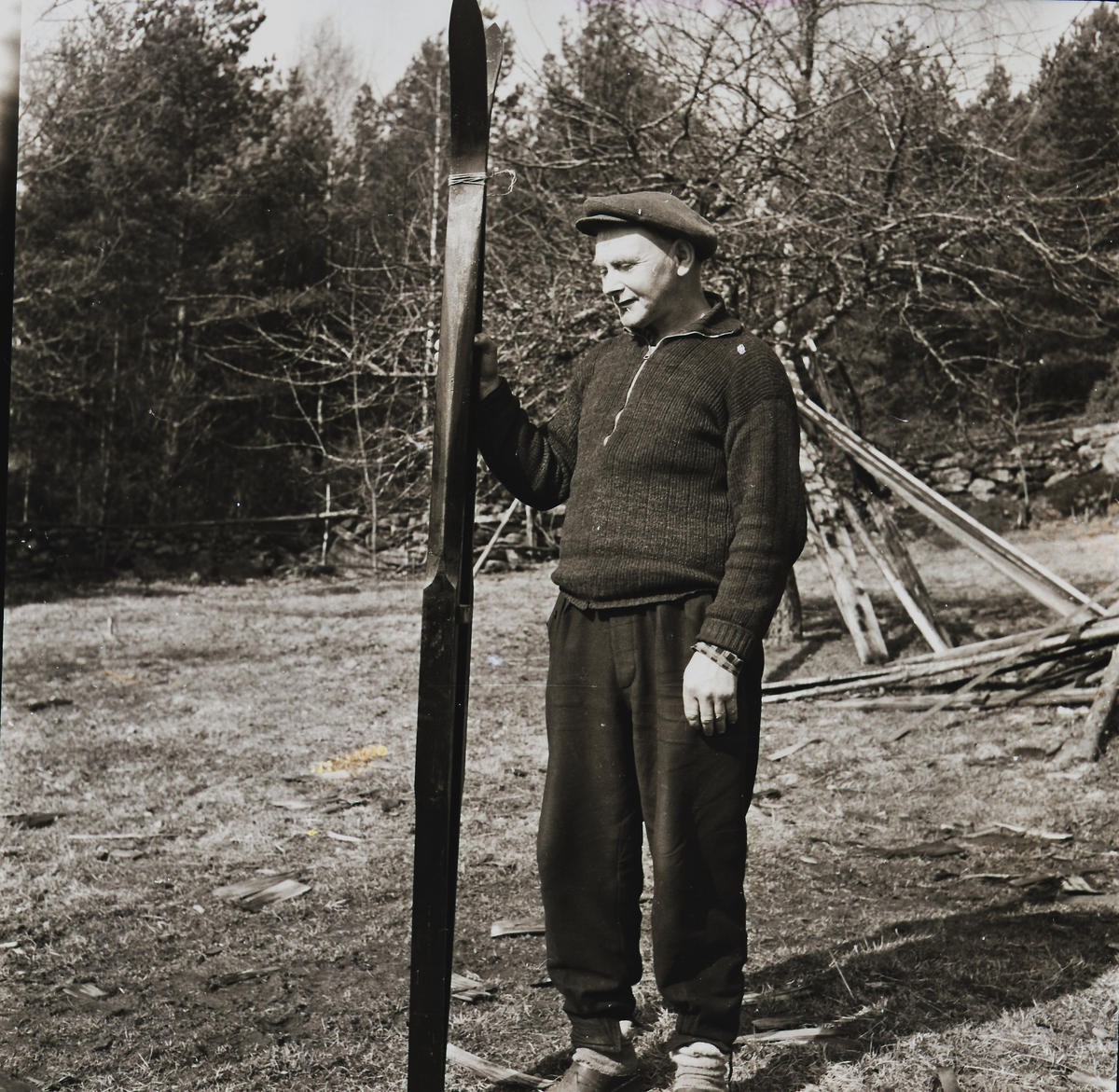 Fotografen poserar med ett par skidor, förmodligen ett av de par han själv tillverkade. Finurlig som han var så hade han kommit på ett sätt att göra skidvalla av paraffin och smälta grammofonskivor.