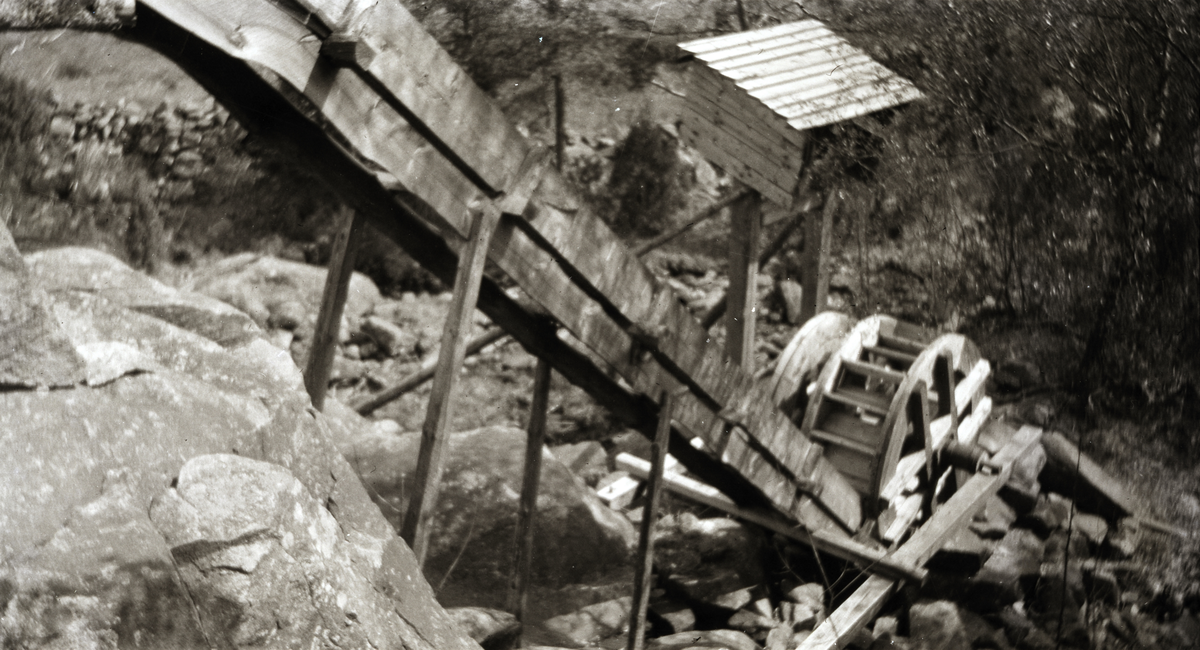 Ränna med vattenhjul som fotografen "Kloar-Erik" själv byggt vid sin stuga. Även om han var en särling, så imponerades många av hans uppfinningsrikedom. Erik var en skicklig snickare som byggde sig ett vattendrivet snickeri med såg och svarv, som han dock sedermera fick inrätta i hemmet och driva med fotogenmotor.