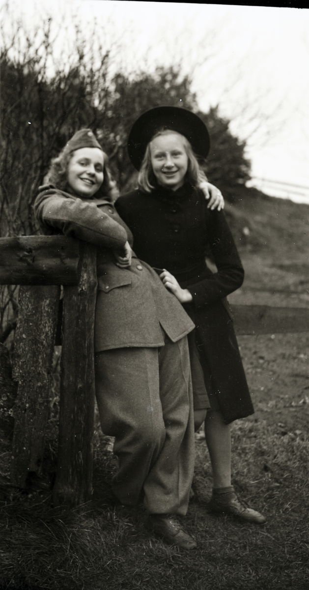 Anna-Lisa Johansson iklädd uniform hänger på ett staket med armen om en väninna klädd i hatt och kappa. Anna-Lisa var flyglotta under kriget, därav klädseln. Hon var född i Rolfstorp med hälsade ofta på hos sina morföräldrar Josefina och Johan-Aron i Hugalyckan i Veddige.