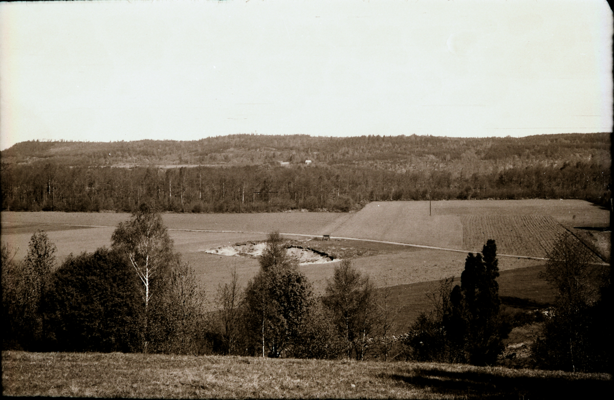 Vy över Hugalyckan och Barkhult. Odlingslandskap mellan åsarna. I bildens centrum ses en sand- eller märgelgrop.
