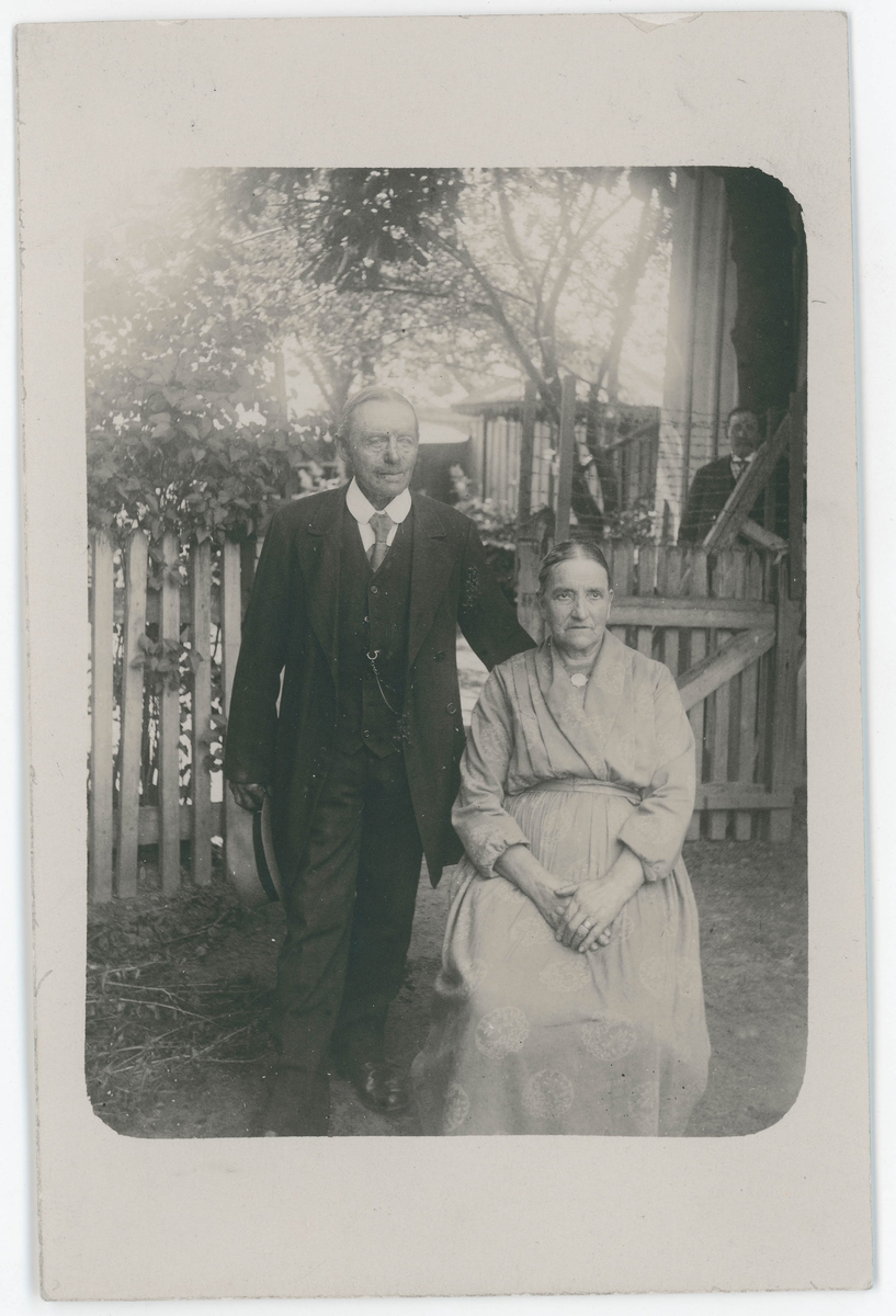 Porträtt på Stensättare August Svensson med maka. I bakgrunden står bokbindargesellen Olof Grönlund. Bilden är tagen på gården till Västra Holmgatan 2.