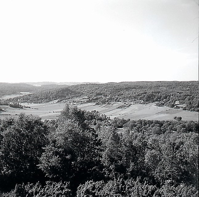 Vy från Sagåsberget över Vommedal och Livered 1940-tal. Till vänster ses Vommedals by och Brattås.
