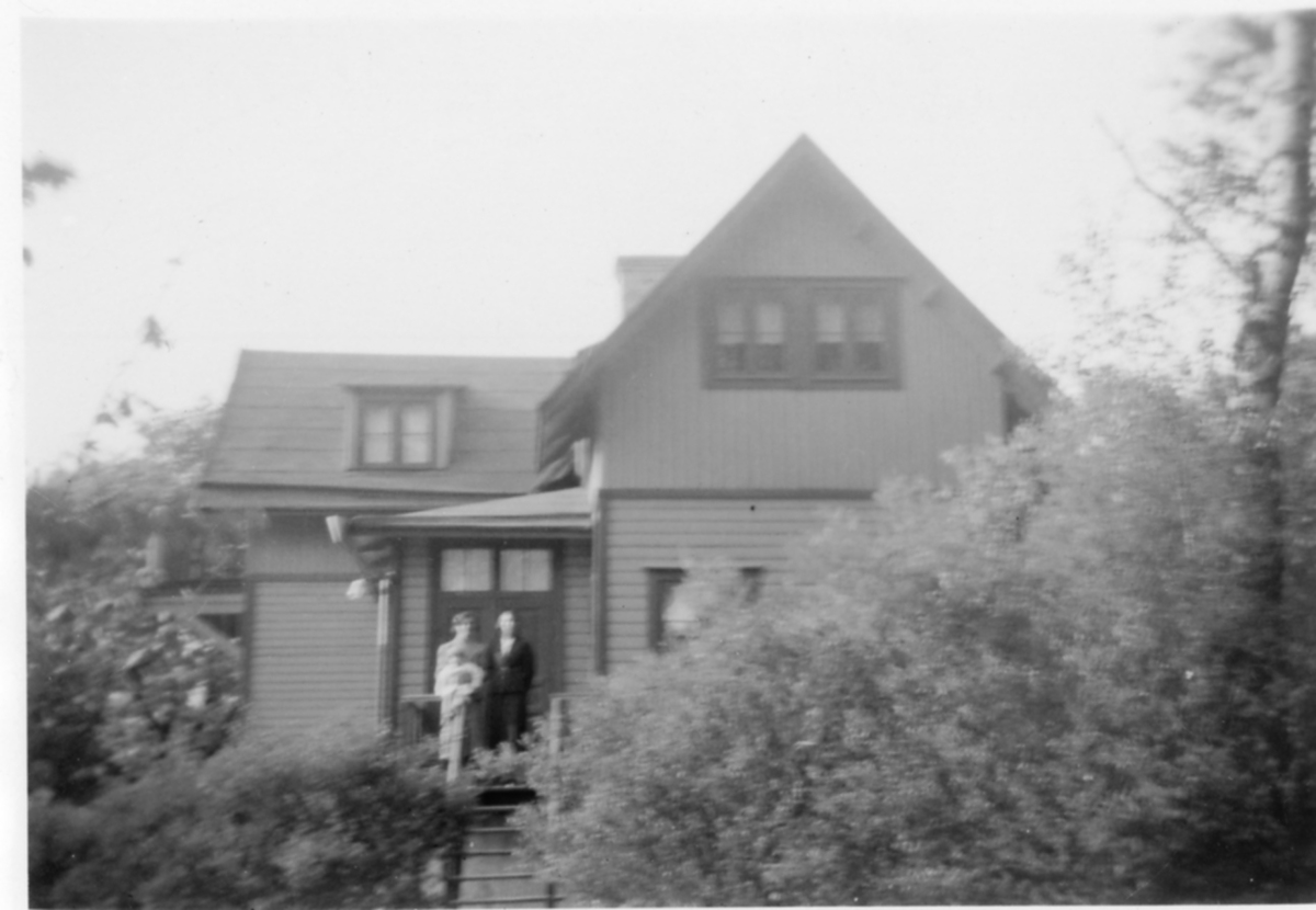 Bostadshus på Norra Kyrkvägen 3 i Kyrkbacken, okänt årtal. Två personer står framför ingången. Ursprungligen byggt av skomakare Amandus Andersson. En av flera villor i området Lugnet.