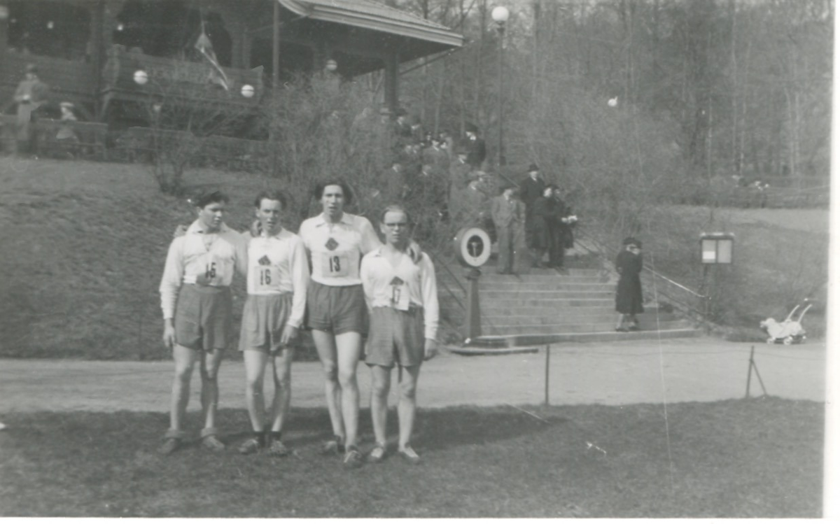 Löpare från KSK (Kållereds sportklubb) där fyra idrottsklädda män/ungdomar står uppställda bredvid varandra på en gräsmatta, okänd plats och årtal. Från vänster: 1. Troligtvis Gösta Ekstedt. 2. Okänd. 3 Troligtvis Arne Andersson (senare Ingelhammar). 4. Okänd. Männen håller varandra om axlarna. I bakgrunden ses en läktare med publik.