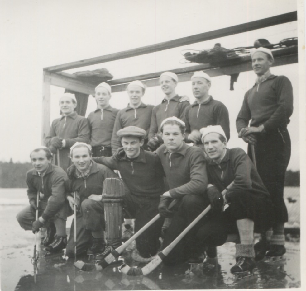 KSKs (Kållereds sportklubb) bandylag står uppställda framför målet cirka 1940.