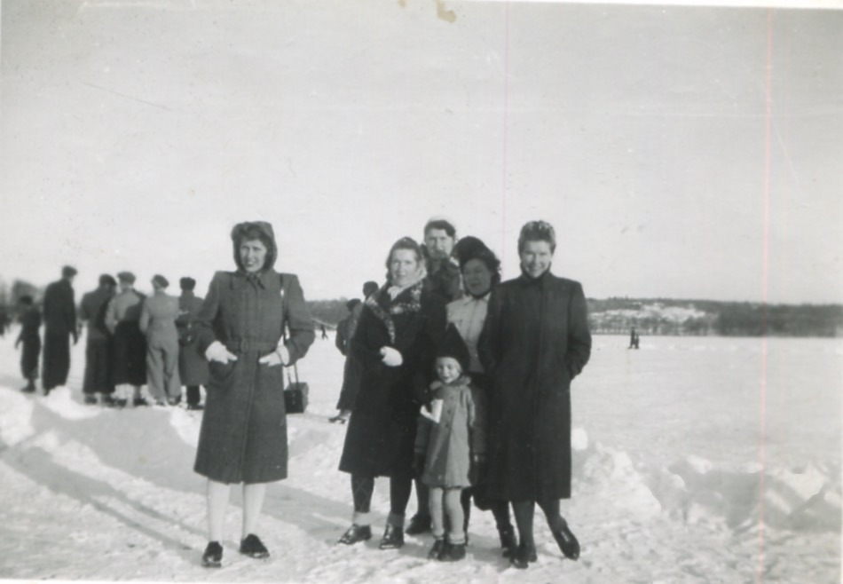 Sex personer från Sporred "Fredriks" står på den snöbelagda stranden vid Tulebosjön, 1940-tal. I bakgrunden ses personer stå och titta ut över isen. Från vänster: 1. Astrid Larsson. 2. Iris "Issi" Larsson. 3. Okänd. 4. Karin Larsson. 5. Agnes Larsson. 6. Barnet är Ulla-Britt Karlberg (gft Söderberg).