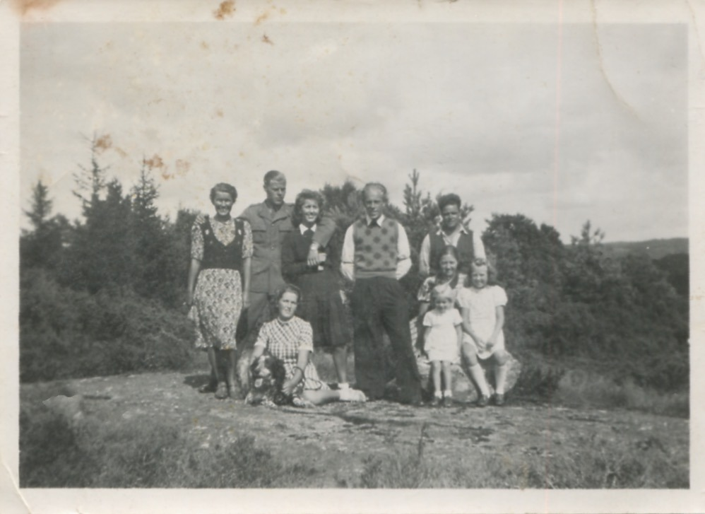 Sittande från vänster: 1. Iris "Issi" Larsson (med hund i knäet, gift Olsson). 2. En kvinna med två flickor framför sig. Den minsta flickan är "Ulla" Ulla-Britt Karlberg (gift Söderberg). En kvinna och en flicka är sommargäster.