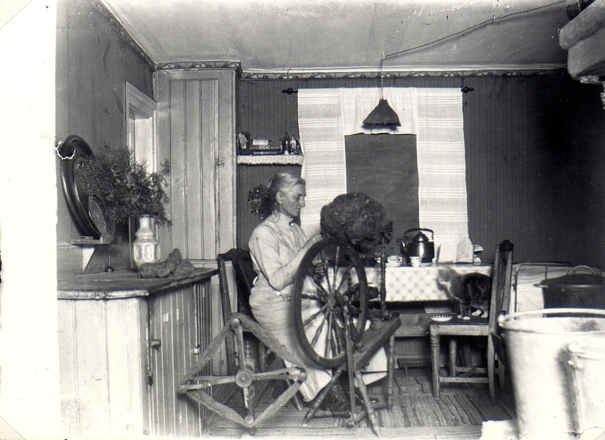 Lydia vid spinnrocken i köket, Hvilan 1920.