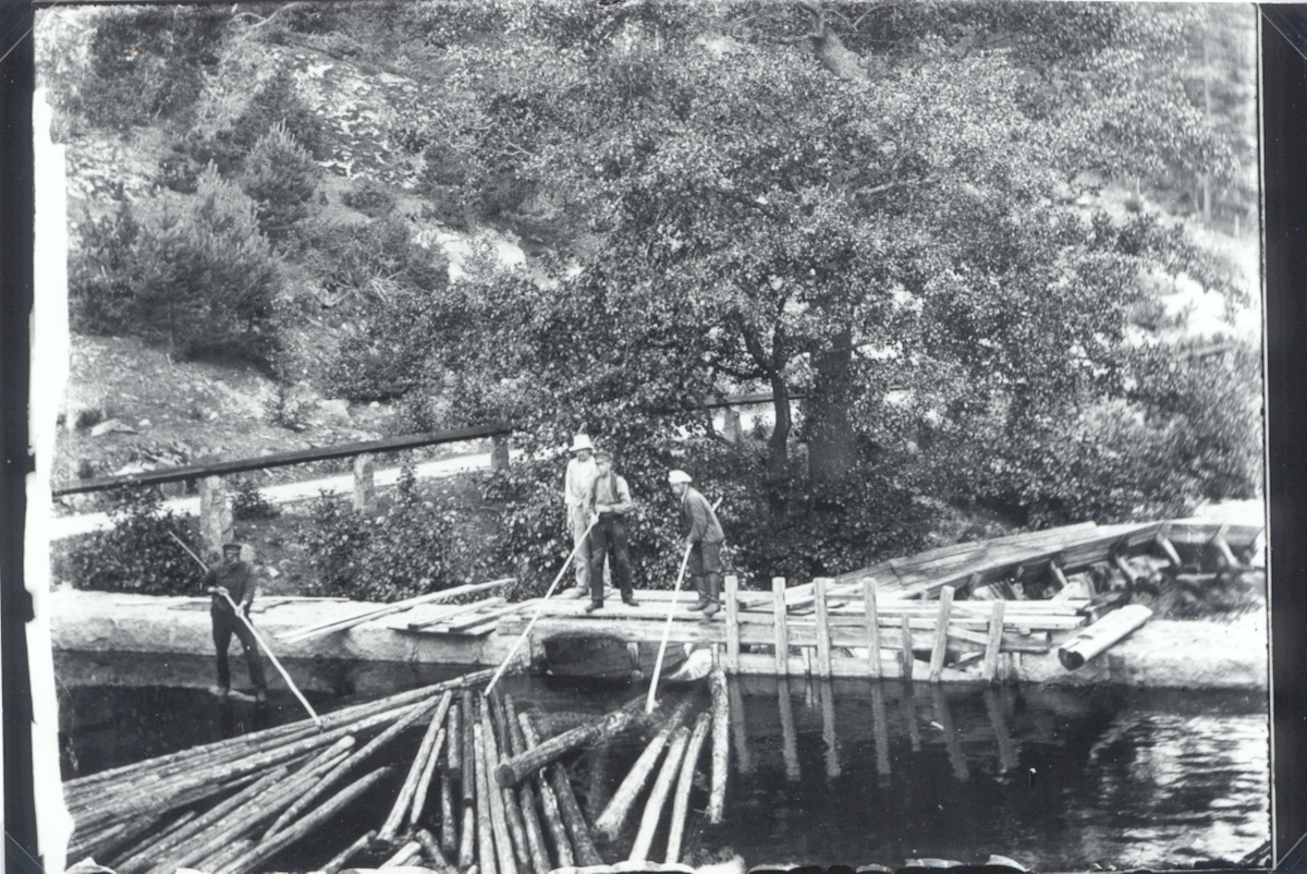 Flottning av timmer i Hjorted. Kortet är taget vid Kvarnbrons sågverk strax utanför Hjorteds samhälle på vägen mot Falsterbo.