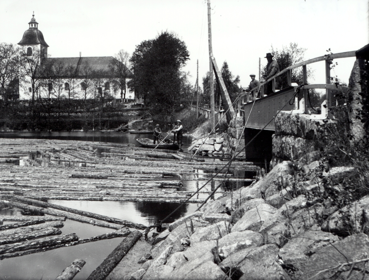 Sundsbro flottarlag 1916 under arbete invid Hjorteds kyrka. Timmerflottning.