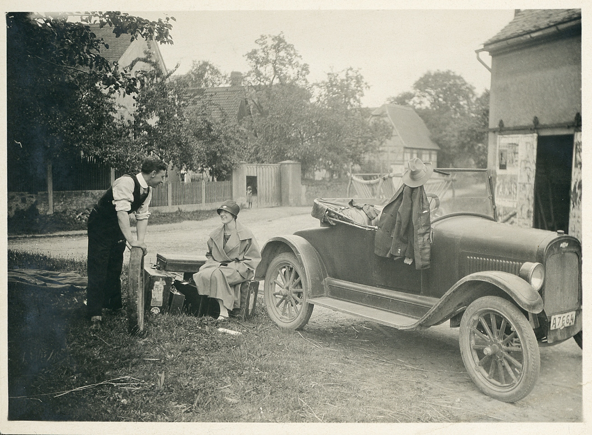C.F. Lidén med fästmö Margareta Bergstedt, vid bilen i en by, trol. någonstans i Sachsen.