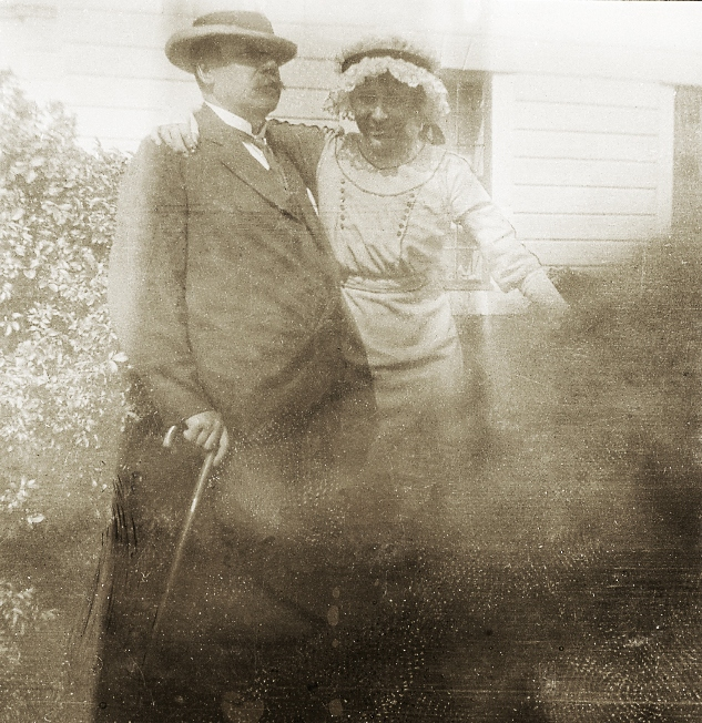 En äldre man och en ung kvinna poserar för fotografen framför ett slottsliknande hus.