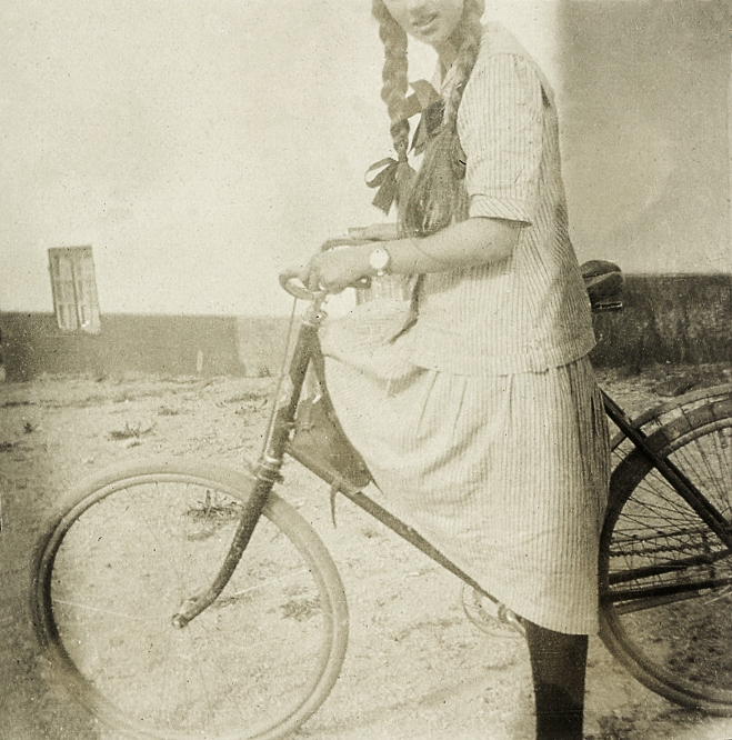 En tonårsflicka i klänning och långa flätor har stannat till på sin cykel.