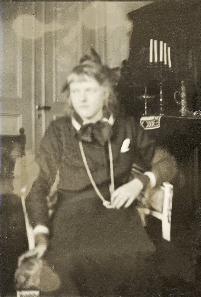 En tonårsflicka i mörk sjömansklänning sitter i en salong, möjl. på kv. Bore 3, Växjö.