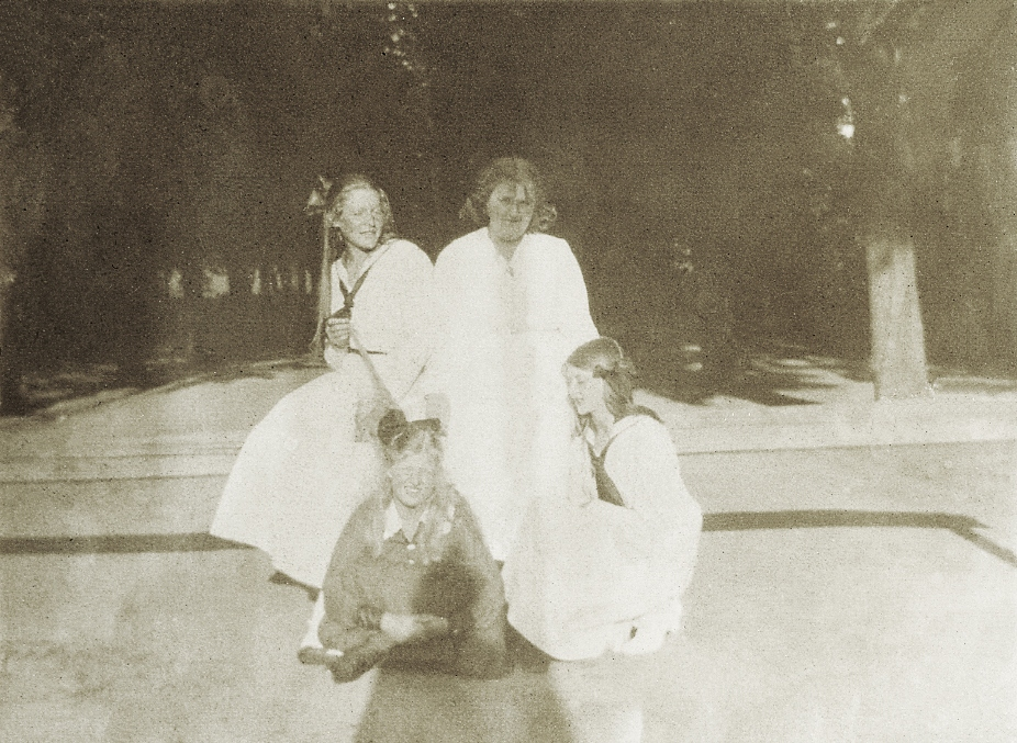 Fyra tonårsflickor i ljusa kläder med sjömanskrage har samlats för fotografen i Strandallén, Växjö.