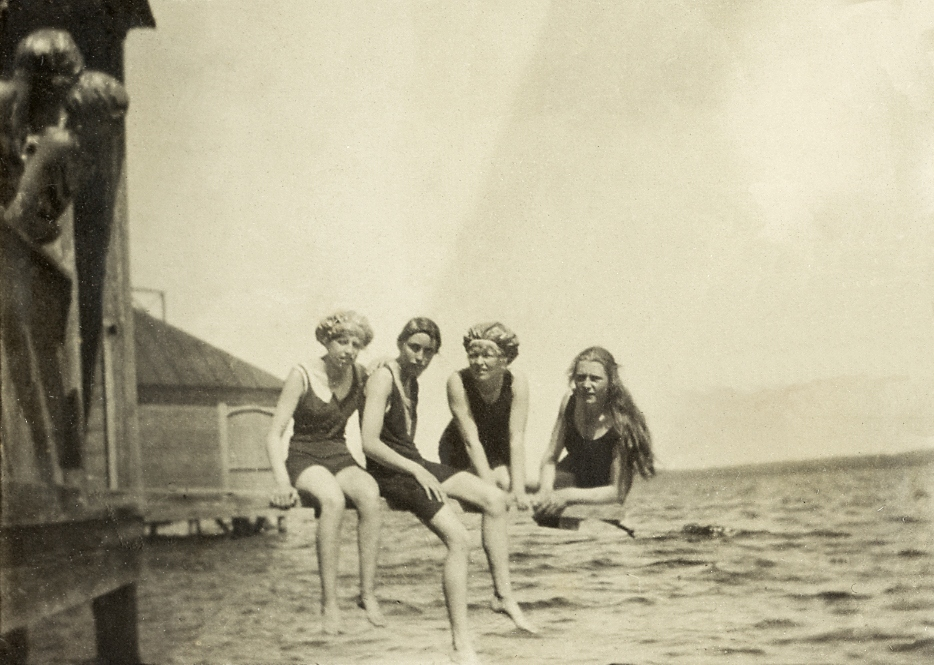 Fyra tonårsflickor i baddräkt på en trampolin, troligen vid kallbadhuset på Evedal, Växjö.