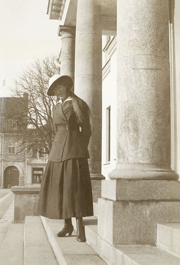 En tonårsflicka i promenaddräkt och hatt poserar på trappan till landshövdingens residens i Växjö.